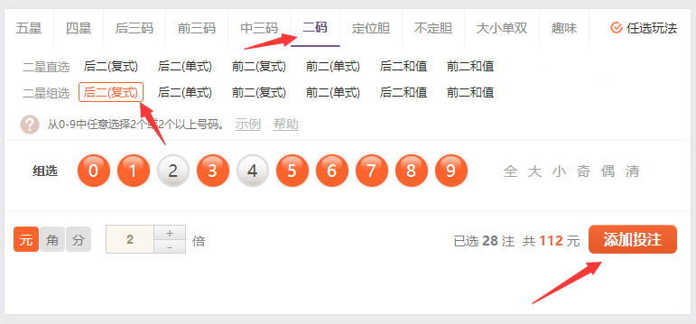 和后二直选一样。只是号码多了一注成本提高,中奖率也提高!